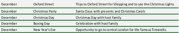 O programu: Dvo- ali tritedenski tečaj angleščine v adventnem času ponuja odlično priložnost za ogled pravljično okrašenega Londona. Navdušite se lahko nam božičnimi nakupi, skodelici vročega božičnega čaja ali se sprehodite v soju luči. Združite prijetno s koristnim! Lahko se odločite za tečaj v obsegu treh ali petih ur dnevno (15–25 tedensko). V skupini je do 14 tečajnikov. Božični program ponuja: Izleti v nakupovalne ulice Oxford Street in ogled božičnih lučk, božična zabava z Božičkom, preživetje božičnega dne z družino gostiteljico, praznovanje Boxing Day z družino gostiteljico, silvestrovanje – priložnost, da se ogleda znameniti ognjemet v osrednjem Londonu.