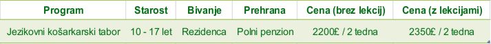 CENE JEZIKOVNEGA KOŠARKARSKEGA TABORA: